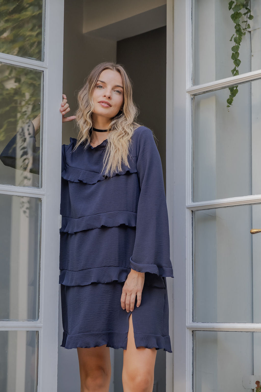 El Vestido Roma Atemporal BLUE es una prenda femenina y versátil que destaca por su diseño fluido y sus delicados detalles en capas. Su estructura con volantes horizontales aporta movimiento y textura, creando una silueta moderna con un aire romántico y sofisticado.